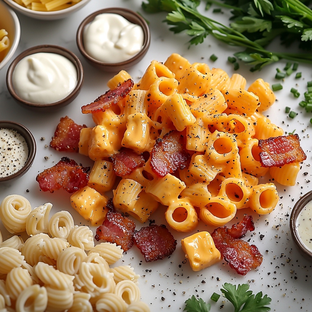 Gathering a handful of simple, familiar ingredients is all it takes to bring this dish to life. Each component adds something special—whether it’s the cheesy bite, the crunch of bacon, or the creamy profile from the dressing—all coming together to make this pasta salad truly unforgettable.