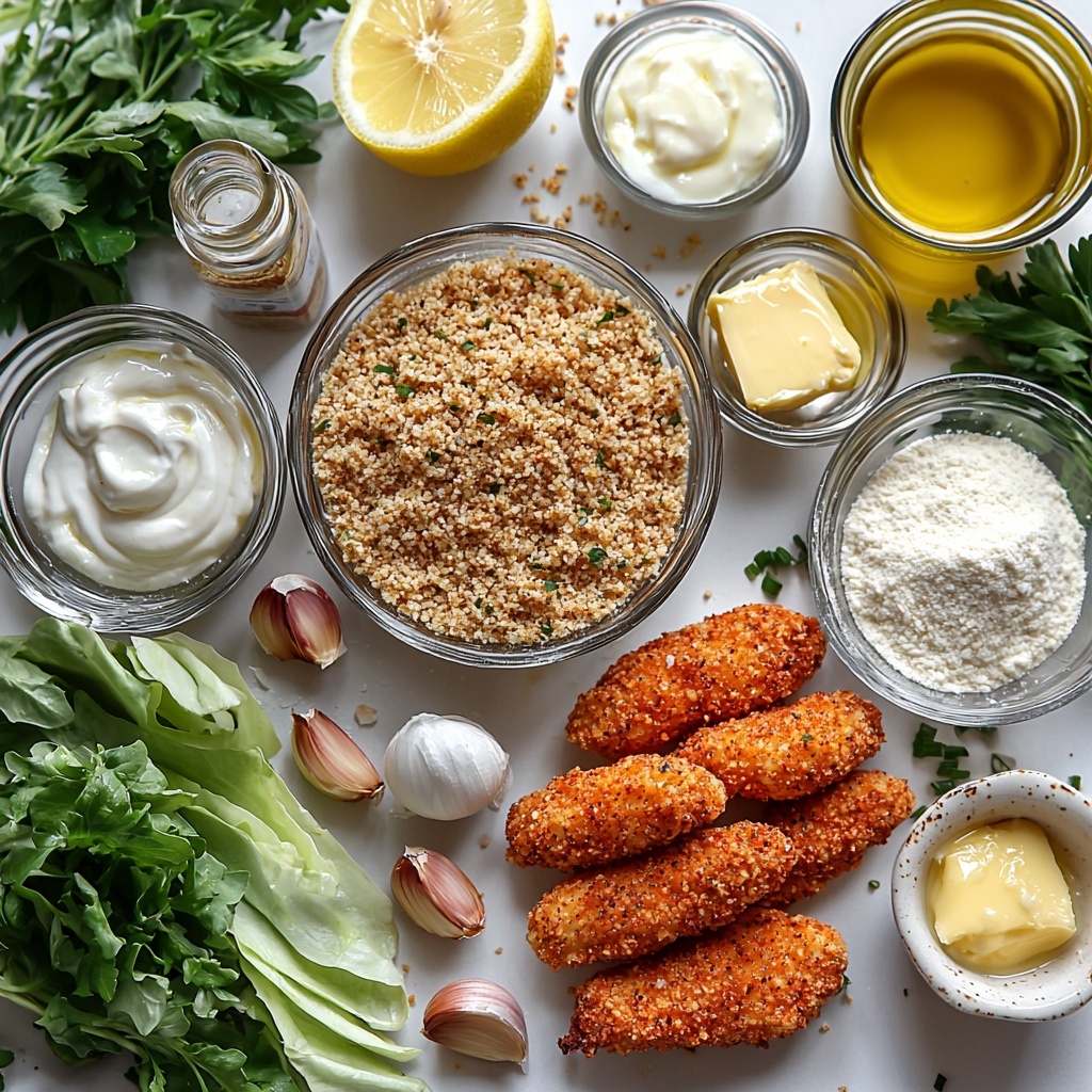 Bring everything together: serve your beautifully crisp and buttery chicken tenders with the cool dipping sauce, fresh cos salad, your choice of crispy fries, and lemon wedges for that bright final twist. Prepare for compliments because this Baked Garlic Parmesan Chicken Tenders Recipe is the ultimate crowd-pleaser!