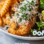 Crispy and flavorful Baked Garlic Parmesan Chicken Tenders coated in a crunchy panko breadcrumb crust, topped with melted garlic butter and Parmesan cheese. Served with a creamy garlic dipping sauce, fresh cos lettuce salad, and your choice of crispy fries, this easy oven-baked recipe is perfect for a satisfying family meal or snack.
