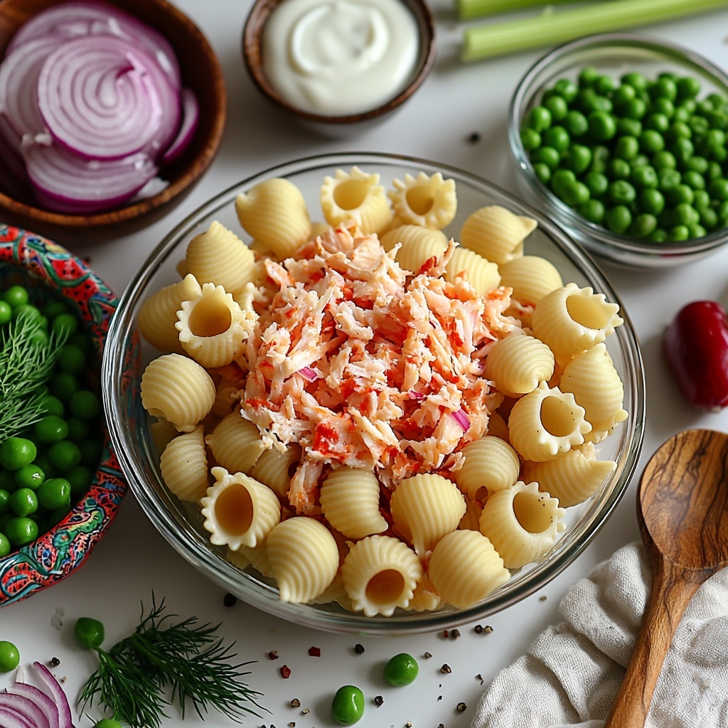 - Combine the Ingredients: In a large mixing bowl, add the cooled pasta, imitation crab meat, thawed peas, finely chopped red onion, celery, and red bell pepper. Mix gently to distribute the ingredients evenly without breaking up the crab.