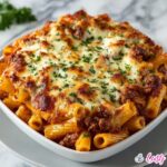 This classic Cheesy Baked Ziti is a comforting Italian-American dish featuring al dente pasta layered with a rich, savory meat sauce and three kinds of cheese. Perfect for family dinners or gatherings, it’s baked to bubbly perfection and garnished with fresh herbs.