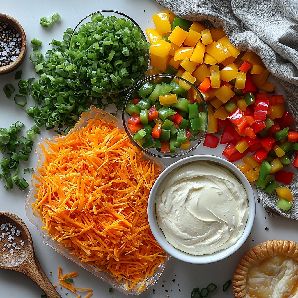 - Prepare Filling: In a mixing bowl, thoroughly combine the cream cheese, shredded cheddar cheese, chopped green onions, diced bell peppers, salt, and pepper until all ingredients are evenly mixed.