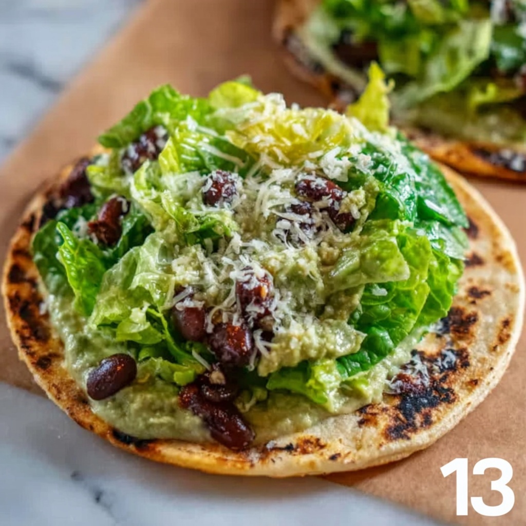 - Serve: Toss the shredded romaine lettuce with the prepared Caesar dressing until evenly coated. Fill each smash taco with a generous amount of the dressed lettuce. Top with crispy bacon pieces, additional freshly grated parmesan, and a sprinkle of the toasted parmesan panko topping. Serve immediately with extra grated parmesan on the side if desired.