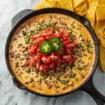 Fresh garnishes are key to elevating the Cowboy Queso Dip Recipe — pico de gallo adds a juicy tomato freshness, jalapeños introduce a welcome heat and snap, and cilantro delivers a fragrant, herbal touch that brightens the entire dish. Don’t be shy about adding these vibrant toppings because they bring a beautiful balance to the rich cheese and beef.