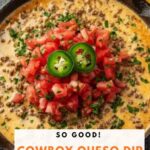 A creamy and flavorful Cowboy Queso Dip featuring ground beef, Velveeta, pepper jack cheese, Rotel tomatoes, and a hint of beer. Perfect for parties or game day, this easy stovetop dip is topped with fresh pico de gallo, jalapeños, and cilantro for an extra kick.
