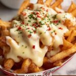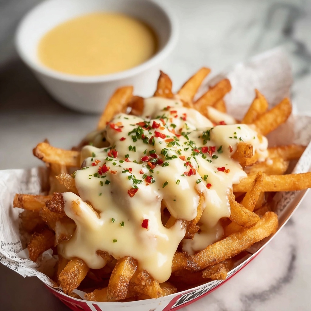 A deliciously indulgent recipe featuring crispy golden fries smothered in a creamy, spicy white cheddar cheese sauce seasoned with ranch and cayenne for a flavorful kick. Perfect as a hearty snack or side dish with a balance of rich cheese and bold spices.