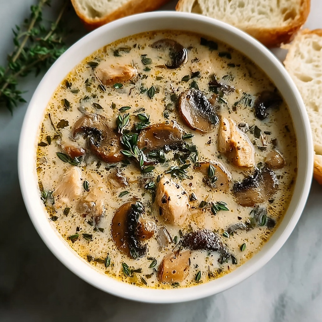 Serve the soup in a hollowed-out bread bowl for a charming and hearty presentation, or layer it in clear glass mugs that show off the creamy texture and tender chicken beneath the mushrooms. Adding a sprinkle of crispy bacon bits or toasted nuts on top can surprise and delight your guests.