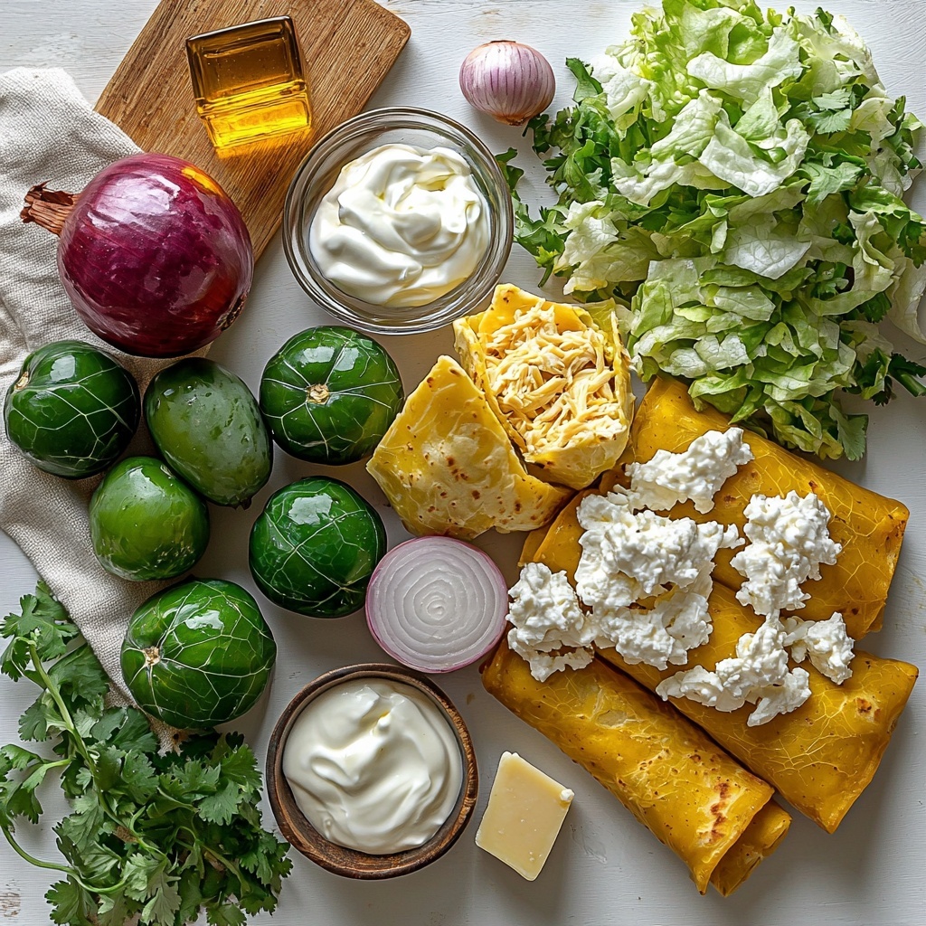 This recipe calls for straightforward, fresh ingredients that combine to create an unforgettable balance of taste, color, and texture. Each component plays an essential role, from the tangy tomatillos to the crunchy flautas and creamy finishing touches.