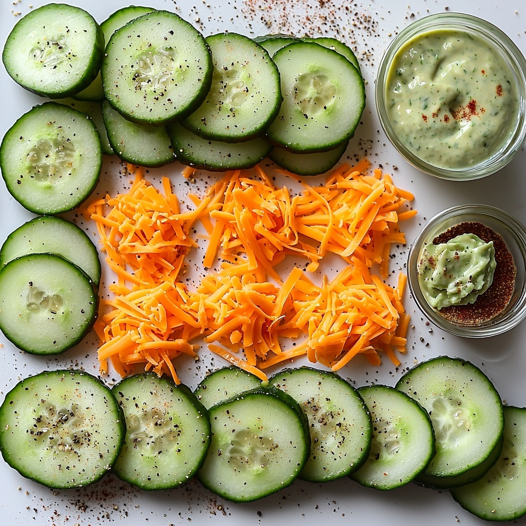 A quick and easy cucumber snack combining fresh cucumber slices with shredded cheese, savory turkey, and flavorful seasonings, all brought together with a creamy avocado lime ranch dressing. Perfect for a light, refreshing, and protein-packed snack.