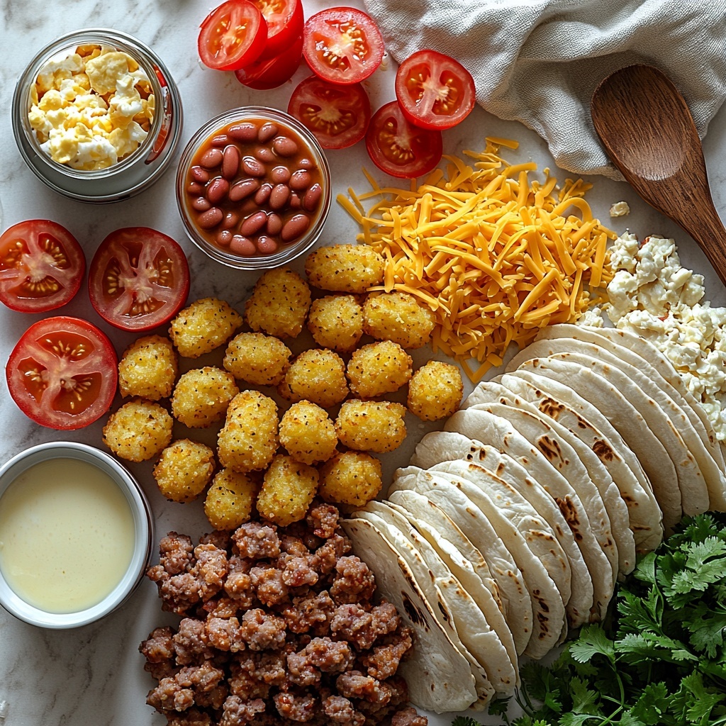 - Assemble burritos: Lay out each flour tortilla flat. Spread a layer of refried beans down the center of each tortilla. Top with a portion of crispy tater tots, sausage and egg mixture, shredded cheddar and Monterey Jack cheeses, diced Roma tomatoes, and chopped cilantro.