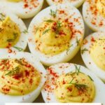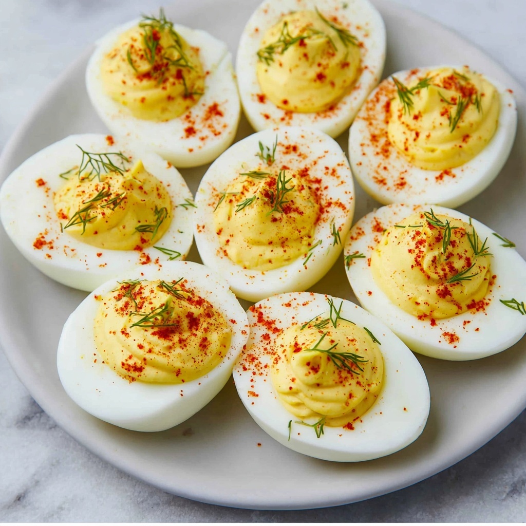 Sprinkle each deviled egg with smoked paprika and a pinch of fresh dill weed. The paprika adds a warm smoky note and a pop of gorgeous color, while dill offers a fresh, herby brightness that complements the creamy filling beautifully.
