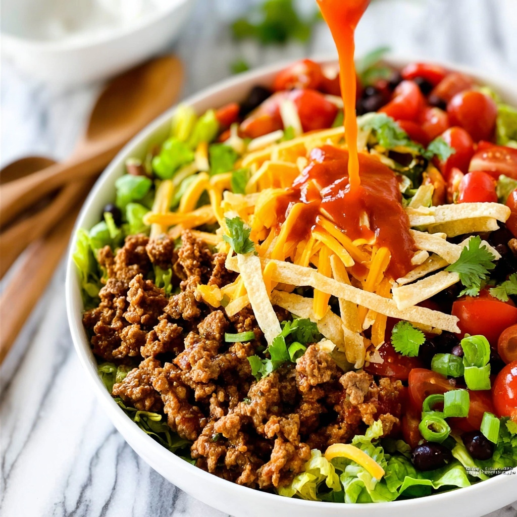 Start by browning the lean ground beef in a large skillet over medium-high heat, breaking it up as it cooks so it’s nice and crumbly. Once fully cooked, drain any excess grease to keep the salad from getting oily. Add the taco seasoning along with the water as directed on the seasoning packet, then stir everything together and bring to a boil. Lower the heat and let it simmer gently for 10 minutes. This slow simmer helps the meat soak up those classic taco spices, making every mouthful packed with flavor. Set aside and allow the seasoned beef to cool slightly so it doesn’t wilt the fresh greens when combined.