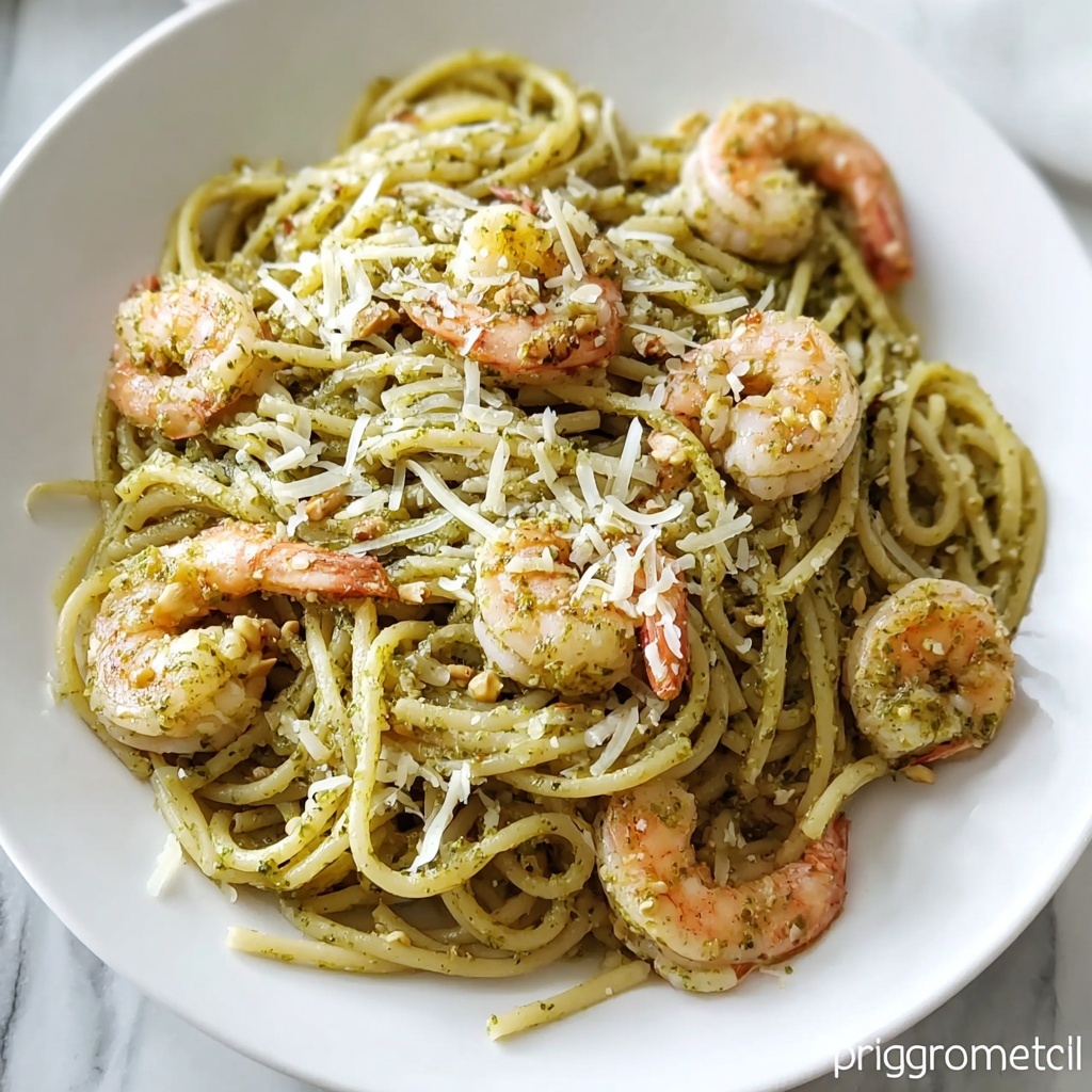 For a stunning presentation, twirl the pasta into neat nests on each plate and arrange the shrimp on top. Drizzle a little extra olive oil or a splash more pesto around the plate edges for a restaurant-quality look. You can also serve it family-style in a large, colorful bowl to emphasize the rustic charm and invite everyone to dig in together.
