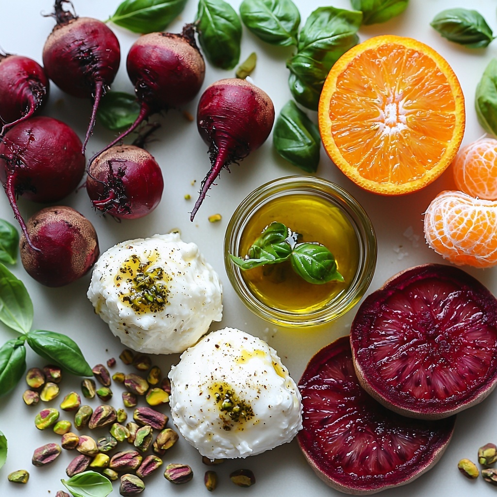 - Assemble Salad: On a serving plate, arrange slices of blood orange and cara cara orange alongside the torn burrata balls. Distribute the roasted beet wedges among the oranges and cheese. Sprinkle chopped pistachios over the top for crunch. Drizzle the prepared basil oil dressing over the salad, then season with flaky sea salt. Garnish with the ripped basil leaves for a fresh finish.