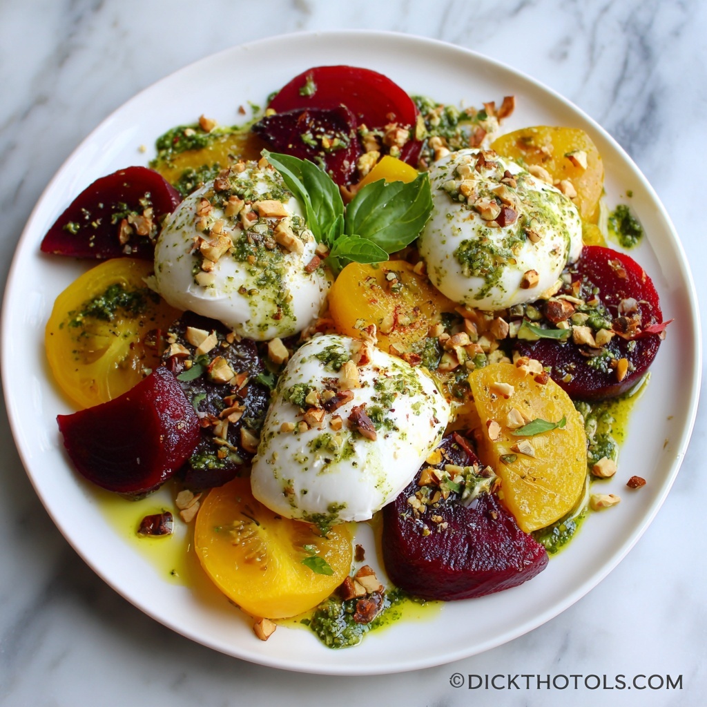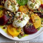 A vibrant and flavorful Easy Roasted Beet and Burrata Salad combining roasted red and orange beets with creamy burrata, fresh citrus slices, crunchy pistachios, and a fragrant basil-infused olive oil dressing. This colorful salad is perfect as a light appetizer or side dish, balancing earthy, creamy, and bright citrus notes.