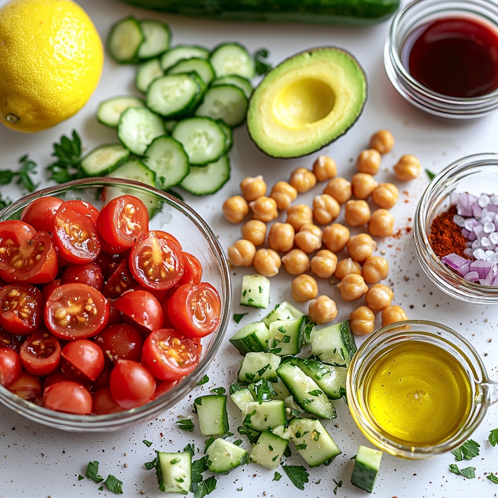 The magic behind this Fresh Chickpea Salad with Tomato, Cucumber, and Lemon Recipe lies in its uncomplicated but thoughtfully chosen ingredients. Each one plays a key role—whether adding crunch, creaminess, or a burst of citrus brightness, these essentials elevate the salad to a whole new level.
