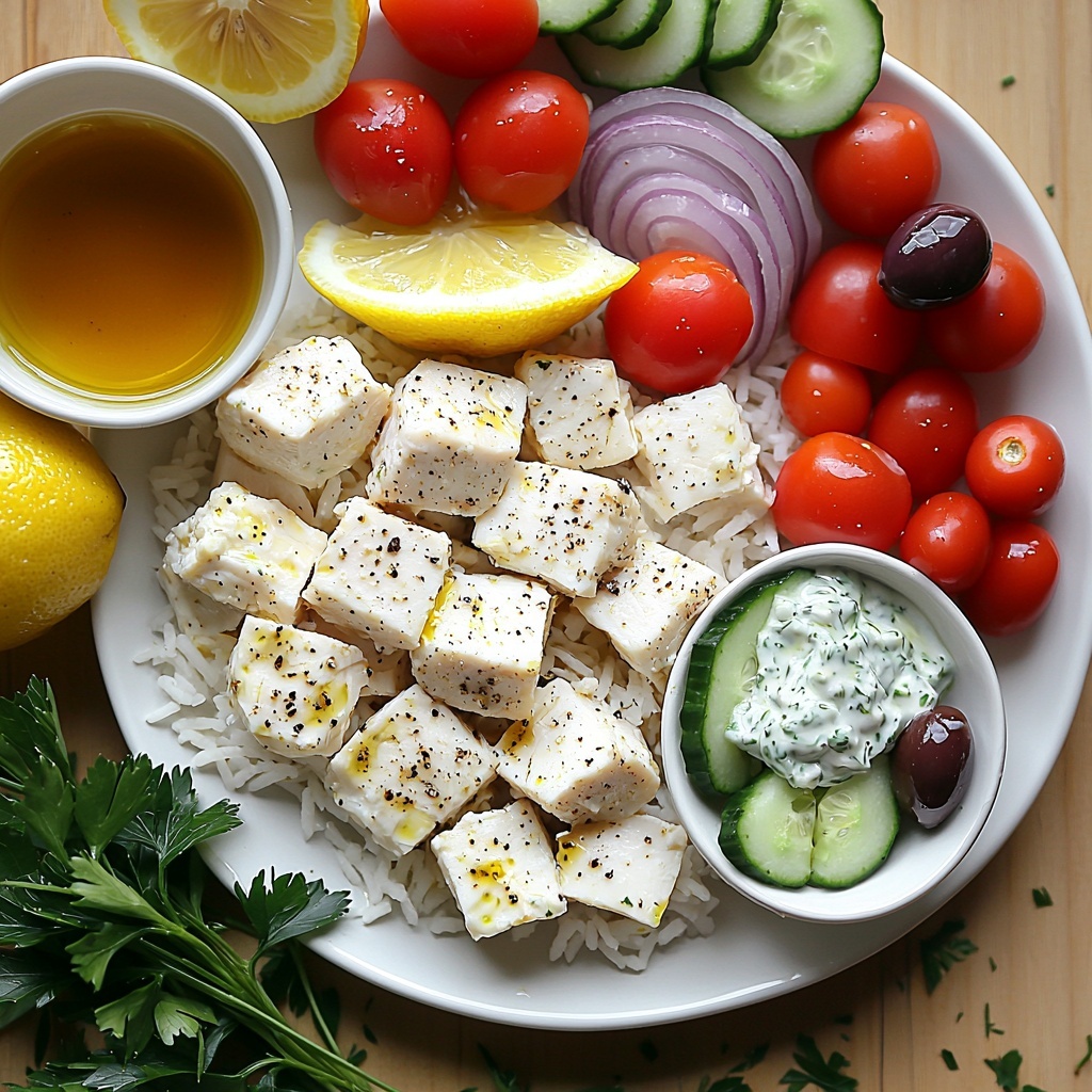 Once your chicken and rice are ready, it’s assembly time! Start with a generous layer of rice at the bottom of your bowl. Next, add the warm, savory chicken chunks. Top that with vibrant halved cherry tomatoes, crunchy cucumbers, thinly sliced red onions, tangy feta crumbles, and those classic kalamata olives for a burst of salty goodness.