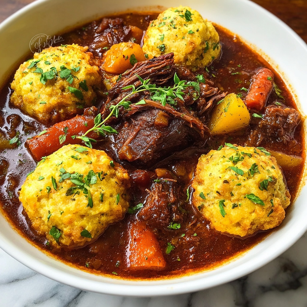 A comforting and hearty beef stew slow-simmered with carrots, potatoes, and aromatic herbs, topped with fluffy cheddar and herb-infused dumplings for a satisfying meal perfect for colder days.
