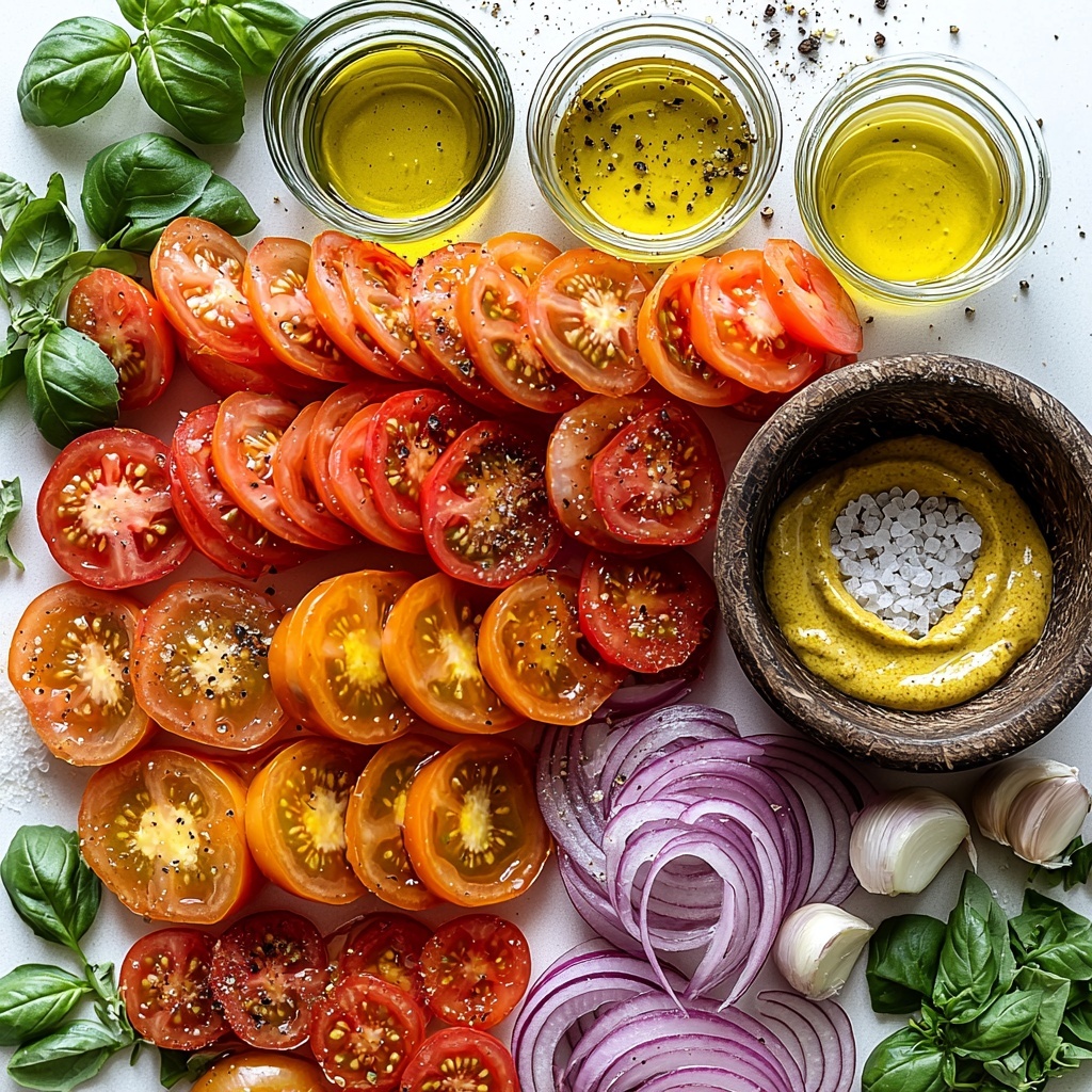 In a small bowl, whisk together extra virgin olive oil, white or apple cider vinegar, freshly squeezed lemon juice, Dijon mustard, minced garlic, sugar if you choose to use it, salt, black pepper, and dried oregano. The Dijon mustard is your secret weapon here—it emulsifies the marinade into a smooth, silky dressing that lovingly coats each tomato slice, marrying all the flavors perfectly.