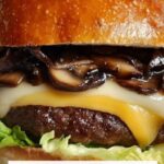 A savory and delicious Mushroom Swiss Burger featuring juicy ground beef patties topped with sautéed baby bella mushrooms, melted Swiss cheese, and fresh lettuce and tomato on toasted brioche buns. This classic burger recipe combines rich umami flavors with a tender, cheesy finish, perfect for a satisfying meal.