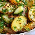 Once your potatoes have come out of the oven, let them cool just enough so they’re warm but not hot. Toss them gently with the chopped cucumber, green onions, pistachios, dill, and parsley. Pour the dressing over everything and give it a careful stir—this helps coat each ingredient without breaking up the tender potatoes. This step is where the magic truly happens, uniting all the colors, textures, and flavors into a delicious masterpiece.