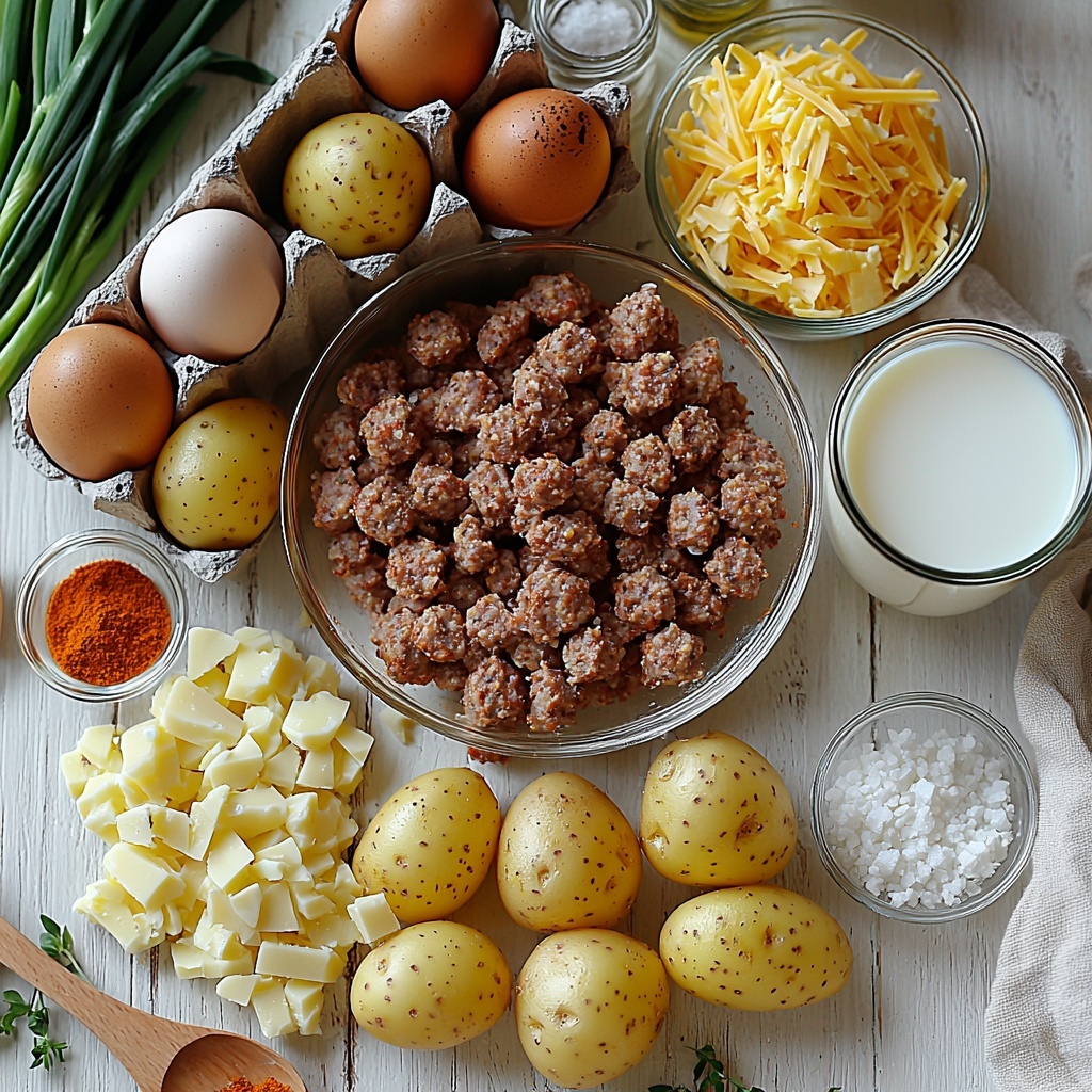 The ingredients for this Sausage and Potato Meal Prep Breakfast Bowls Recipe are straightforward but essential, combining to create a perfect balance of textures and tastes. Each item was chosen to build layers of flavor, whether it’s the savory sausage, the spiced potatoes, or the creamy scrambled eggs topped with melty cheese and fresh green onions.