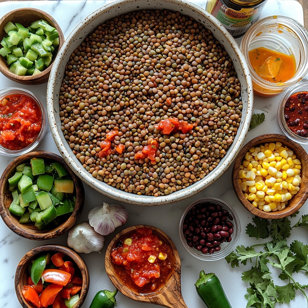 - Combine Ingredients: Add lentils, diced onion, green and red bell peppers, jalapeño, minced garlic, rinsed black beans, crushed tomatoes, vegetable broth, frozen corn, and salsa into a 6-quart slow cooker.