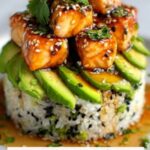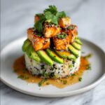 A delicious Teriyaki Chicken Avocado Rice Stack featuring tender marinated chicken, creamy avocado slices, and perfectly seasoned sushi rice, layered for a visually stunning and flavorful dish.